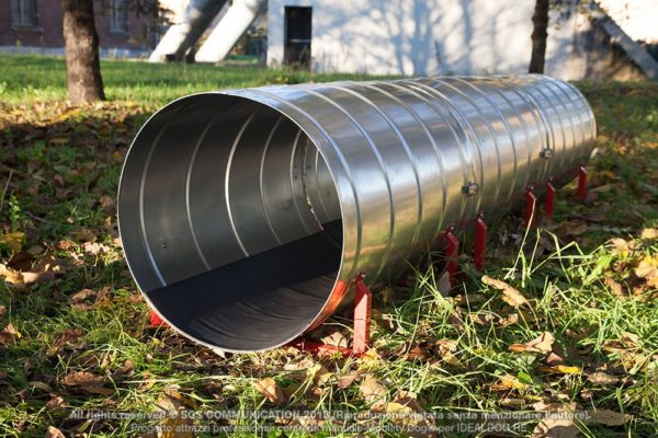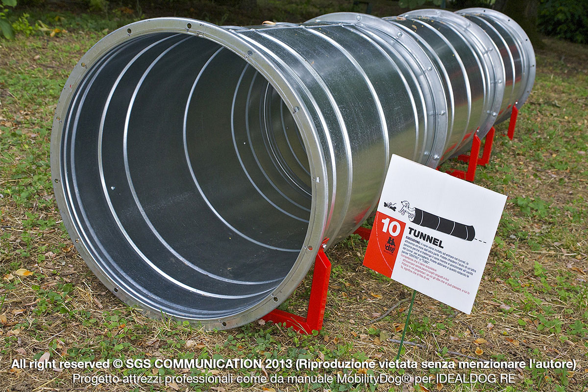 ESECUZIONE ESERCIZIO: il cane viene invitato ad entrare nel tunnel rigido, lo attraversa ed esce dall’altra parte. Potete chiedere l’aiuto di un’altra persona perché vi trattenga il cane mentre vi posizionate all’uscita del tunnel per accoglierlo. Potete abbinare a questo ostacolo le parole “DENTRO” o “TUBO”.